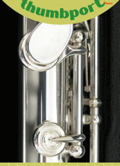The Thumbport allows greater balance in holding the flute. It is comprised of a C-shaped shell and a thumb-like extension. The Thumbport helps the player to place the right thumb at an efficient spot and provides additional support.