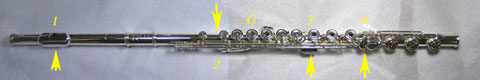 解決方案 李鶴凡右拇指平衡輔助器裝設在長笛 F 鍵下方﹝可依個人情況稍微調整位置﹞,以夾持的方式固定於笛身。 使用時,右拇指應著力於圖3中A處;平衡輔助器的延伸臂應輕輕落在拇指上,如圖3中B處。 因為右拇指推向A處,此力可以支撐長笛部分的重量,並對抗水平旋轉之力量,進而達到平衡。 延伸臂在B處的落點則能提供相反於樂器向後倒下﹝剖面旋轉﹞之力。 圖 3